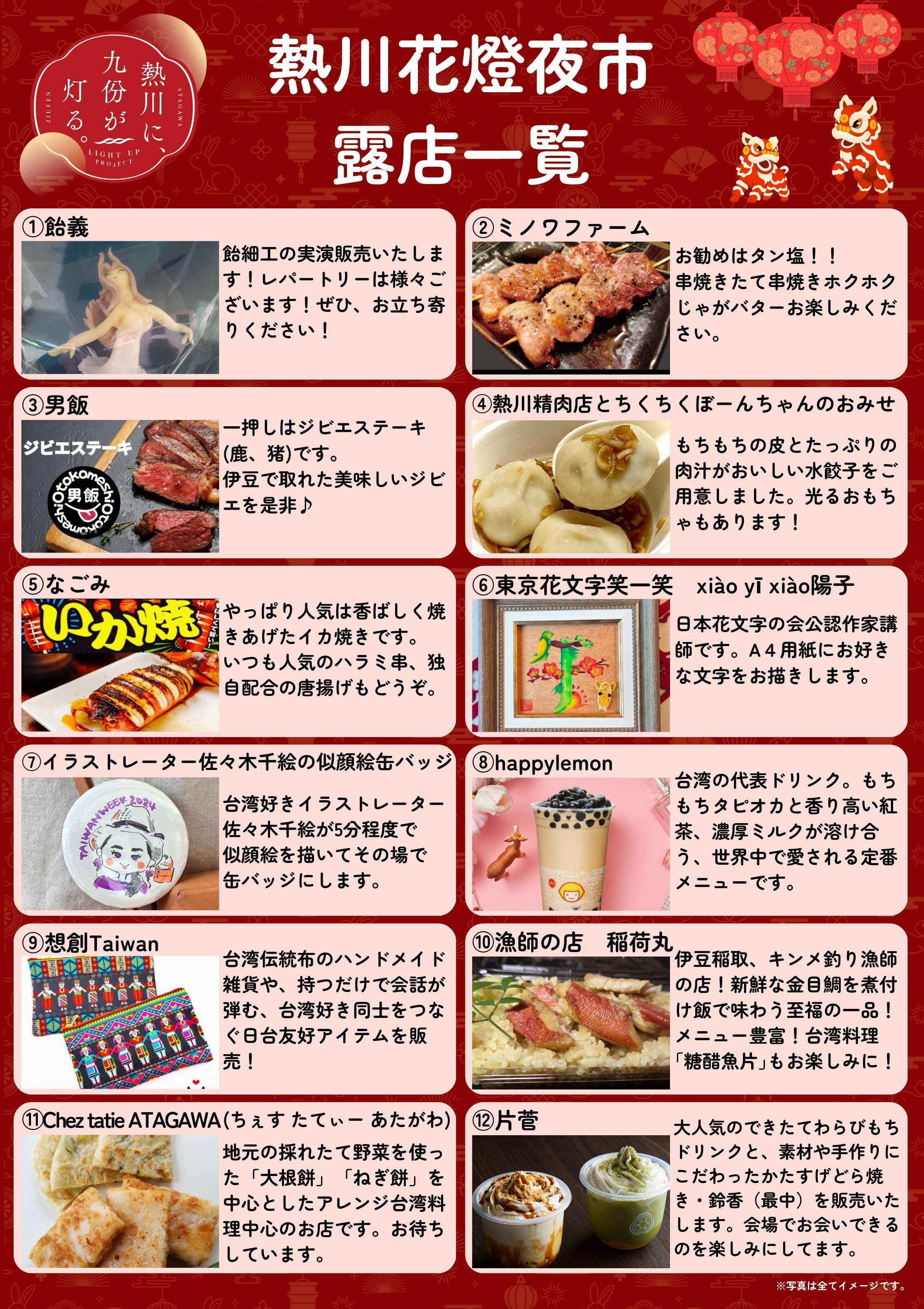 会場には台湾グルメや地元飲食店に加え、台湾雑貨の販売や似顔絵ブース、飴細工の実演などの体験型出店を含め、約25店舗が出店します。歩いて楽しい、夜市ならではの空間が広がります。