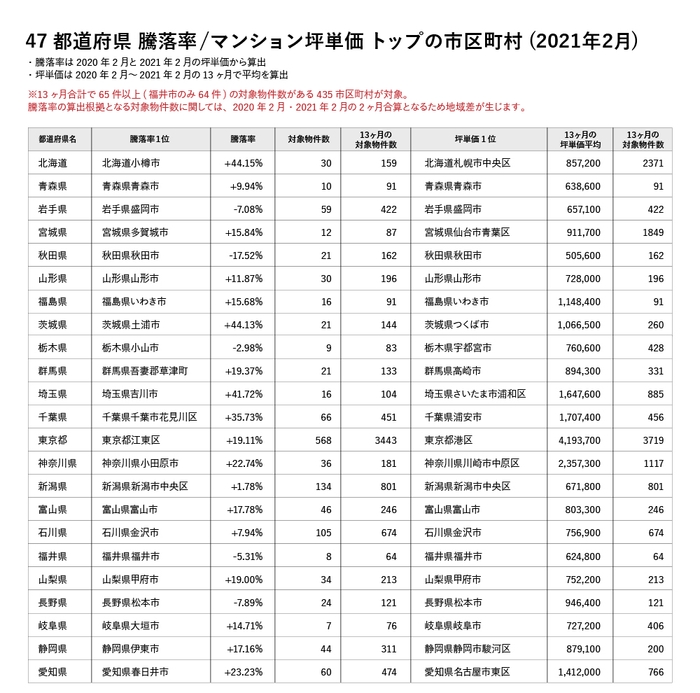 ■47都道府県 騰落率/マンション坪単価 トップの市区町村(2021年2月)