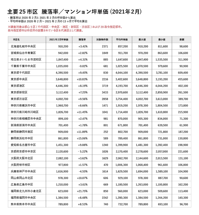 「マンションレビュー」2021年2月 全国市区町村 マンション坪単価・騰落率ランキング発表