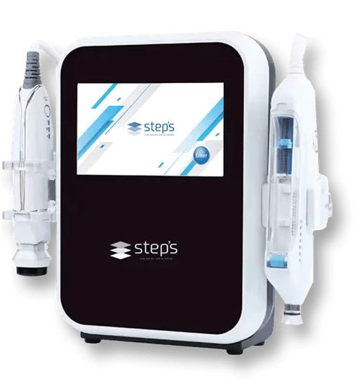 「Step'sプログラム」のメインマシンである、『Step's』はエアバリ(エアーニードル)でのエステマシン。針なしで安全に水光導入エアー& EMSマッサージ機能で2役in1台で大変便利な1台となります。