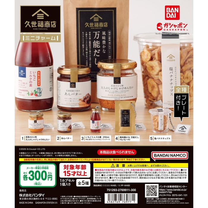 株式会社サンクゼールは、株式会社バンダイ (本社:東京都台東区)とコラボレーションし、全国のガシャポン®自販機にて、久世福商店で人気の5商品がミニチャームとなって発売されることとなりました。久世福商店の看板商品である「風味豊かな万能だし」を含めた全5種類をご用意いただいております。