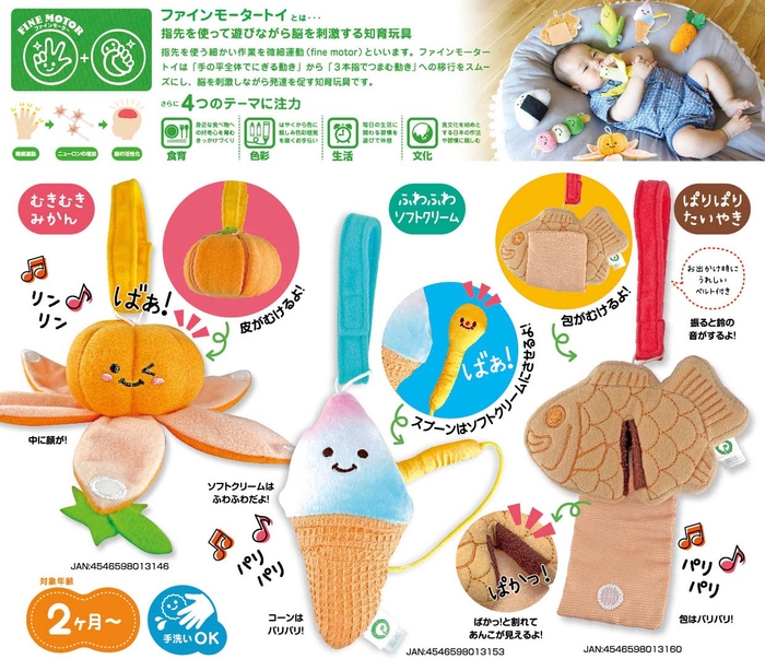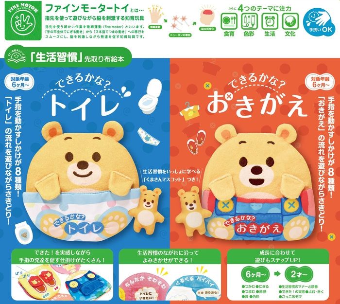 指先を使って、遊びながら脳を刺激する知育玩具 ファインモーター マナー布絵本シリーズ、ミニトイシリーズ 発売
