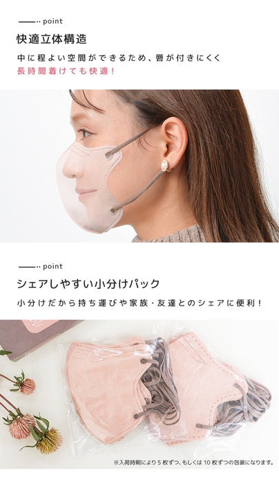 また、マスクの内側に程よい空間ができるため、唇が付きにくくメイク崩れや蒸れを軽減、長時間の着用も快適です。