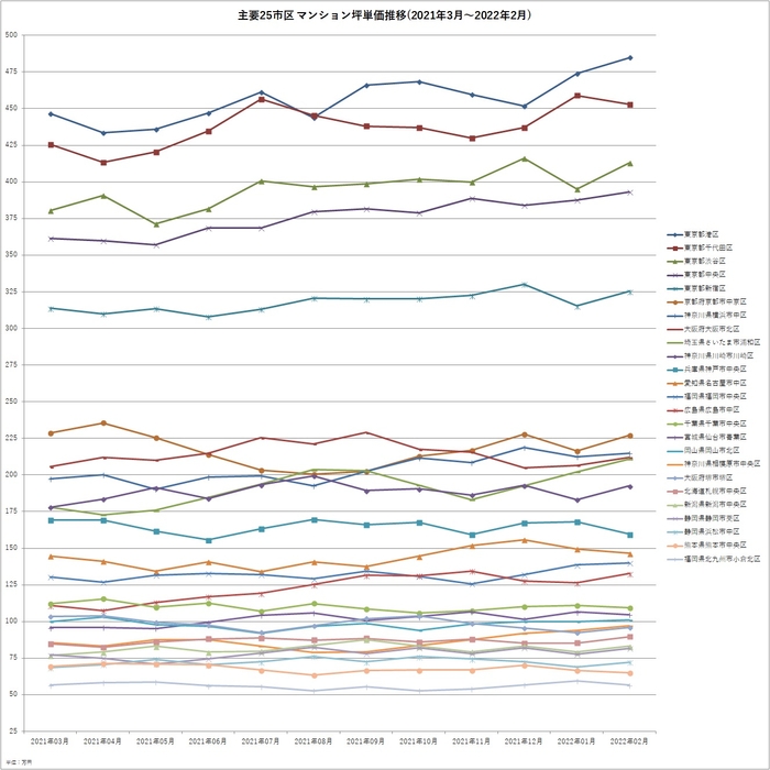 ■主要25市区 マンション坪単価推移(2021年3月~2022年2月)