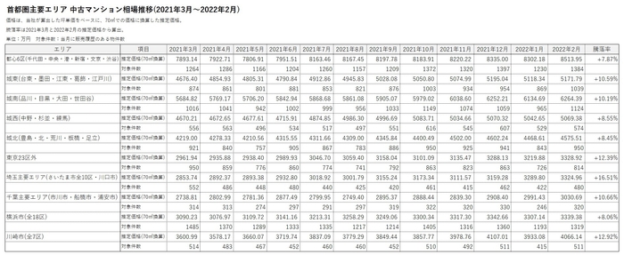 ・東京都内各エリアでの2022年2月の推定価格は以下の通り。いずれも2022年1月より上昇した。