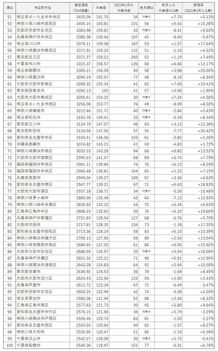 当社が保有する中古マンションの販売履歴データを元に「坪単価」を算出し、70㎡での価格に換算した「推定価格」によるランキング。2022年2月の対象件数(当月に販売履歴のある物件数)が30件以上ある全国199市区から、トップ100を掲載。