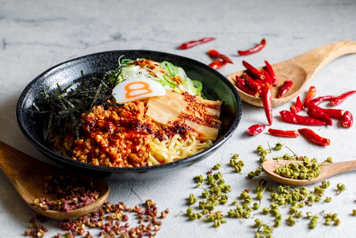 8番らーめん人気の汁なしまぜめん「唐麺」を“ガツン”と刺さるようなシビカラを楽しめる“麻辣味”にアレンジしました。「唐麺タレ」の 風味(香味油)と、旨み(鰹・昆布・チキン)に、痺れと辛みが加わり、クセになるおいしさ。具材をしっかり混ぜてお召し上がりください。