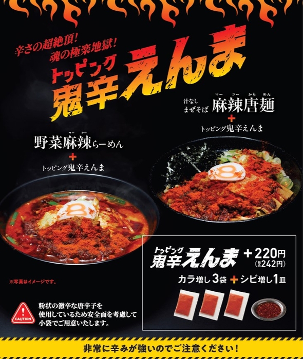 激辛好きに是非チャレンジしてほしいトッピングをご用意しました。カラ増し3袋と、シビ増し1皿を組み合わせた「鬼辛えんま」は、「野菜麻辣らーめん」、「麻辣唐麺」にトッピングをしてお楽しみください。