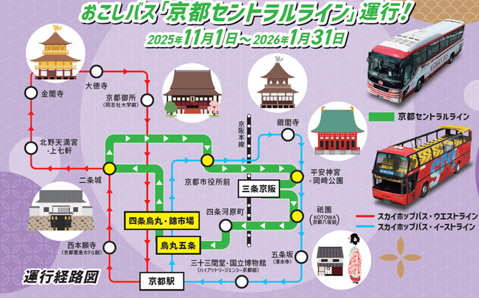 京阪バス株式会社(本社:京都市、社長:三浦達也)では、オーバーツーリズムによる京都市内の公共交通機関の混雑及び京都駅への一極集中の緩和に寄与することを目的に、11月1日(土)より三条京阪を起点とした京都市内観光循環バスを期間限定で実証運行いたします。