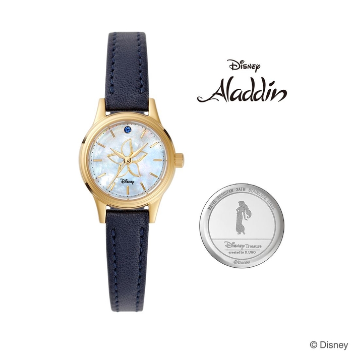文字盤の白蝶貝と天然石のきらめきが上質な印象を添える、大人のためのディズニーデザインウォッチ。作品を象徴するモチーフや、天然石&ベルトの配色でそれぞれのディズニープリンセスの世界観を繊細に表現しています。