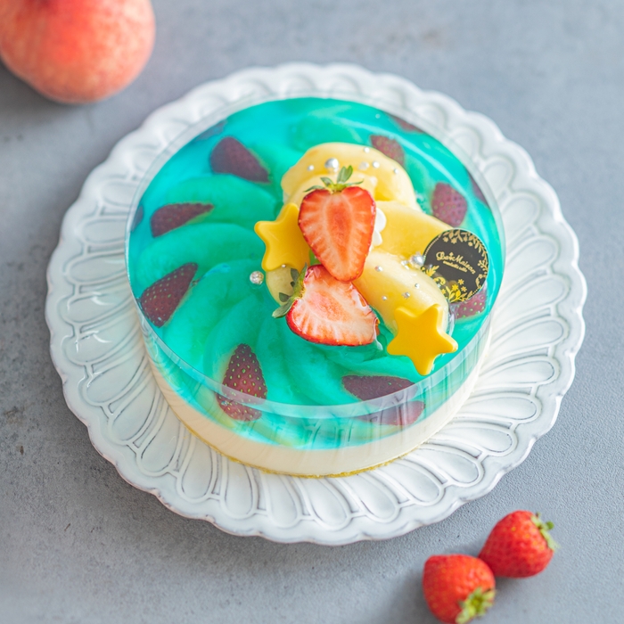 なめらかなフロマージュムースに旬のみずみずしい白桃やいちごを爽やかなブルーキュラソーのジュレにとじ込めました。
