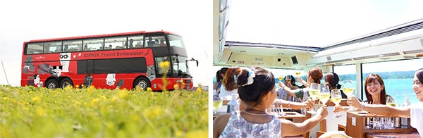 バス車内で提供する料理は、ホテル阪急インターナショナル調理長監修の全6品のフレンチフルコースです。淡路島産の食材とエディブルフラワーに彩られたメニューは、春の淡路島に広がる花畑をイメージしており、バス1階のキッチンでシェフが丁寧に仕上げた出来立てのお料理を提供します。また、高さ約3mの2階の座席からは、普段とは異なる目線で淡路島の景色を楽しむことができるほか、透明で開閉式のオープンルーフは開放感があり、レストランバスならではの非日常的なひとときをお過ごしいただけます。