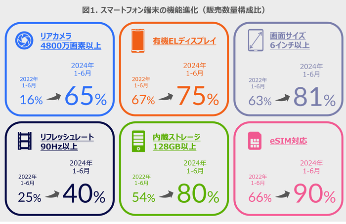 端末価格が上昇する一方で、スマートフォンの機能もそれに見合った進化を遂げている。各機能の販売数量構成比をまとめた(図1)。2年前と比較して、高画素カメラを搭載する端末が増えて、きめ細やかな写真撮影を可能にしている他、有機ELディスプレイや、6インチ以上の大画面、リフレッシュレート90Hz以上といった、より動画やゲームを楽しめる端末も伸長した。大量の写真や動画を保存するための内蔵ストレージにおいても大容量化の傾向が見られた。物理的なSIMカードが不要なeSIMに対応する端末も既に9割に達した。