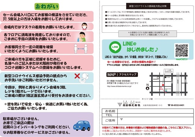 また、万が一に備えてお客様のお名前お電話番号のご提示、もしくは大阪府が提供するコロナ追跡QRコードへのご登録をお願いします。