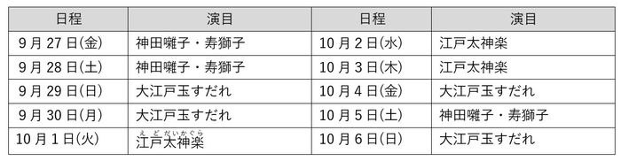 「江戸城下のにぎわい」をテーマとした、江戸時代から続く伝統芸能公演をお楽しみください。