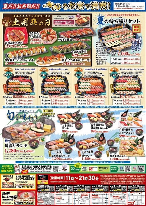 兵庫県姫路市を中心に回転寿司力丸を12店舗、海鮮どんぶり店1店舗、お持ち帰り専門店1店舗を展開する株式会社関西フーズ(代表取締役:福永 力夫)は、2023年7月7日(金)~8月31日(木)まで期間限定で夏の寿司まつりを開催します。地域の皆様、お子様に旬魚や地元の魚を知っていただくために実施している期間限定のフェアでございます。
