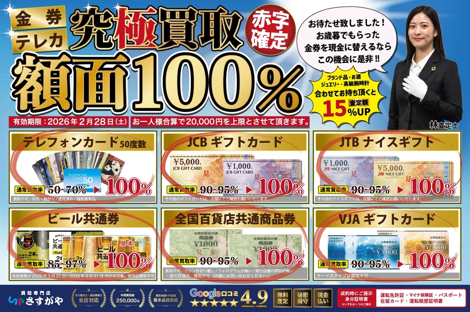 全国の買取専門店さすがやでは、2026年2月限定で【究極買取 額面100%キャンペーン】を実施いたします。