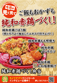 純和赤鶏とは希少価値が高く品質の評価も非常に高い鶏肉で、適度な歯ごたえと弾力、旨味が濃い肉質が特徴。精肉売り場にて純和赤鶏を販売しており、お客様から大変ご好評をいただいております。おいしい純和赤鶏をもっと知っていただくために開発された「純和赤鶏づくし弁当」は、からあげグランプリⓇにて5年連続金賞以上を受賞している「純和赤鶏むね塩唐揚げ」や「純和赤鶏メンチカツ」が入っており、ごはんにも純和赤鶏エキスを使用して炊きあげています。