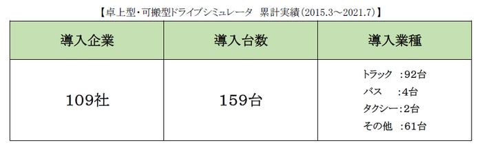 また、仮に指導監督の一環として、一般診断(任意診断)を行うにしても、実施機関の設備には 限りがあるた め、受診予約しようにも、予約で一杯になるケースが多く見られるようです。 昨年、感染症予防の観点から実施機関が一般診断(任意診断)の受付が停止されたこと、 旅客需要の減退 によりドライバーへの教育時間の見直しの動きが各社にあったことを受け、卓上型ドライブシミュレータの引き合 いがやや増えたものの、実績はここ数年伸び悩んでいる状況です。 累計導入企業数は、7月末時点で100社を超えました。 潜在的にはまだまだ体験型の安全教育ツールとして需要があると考えており、今後認知活動を続けてゆく予 定です。当社としては、今後、国土交通省による「事故防止対策支援推進事業」に、あらたに「非接触 指導監 督に資する機器」の創設を働きかける予定です。