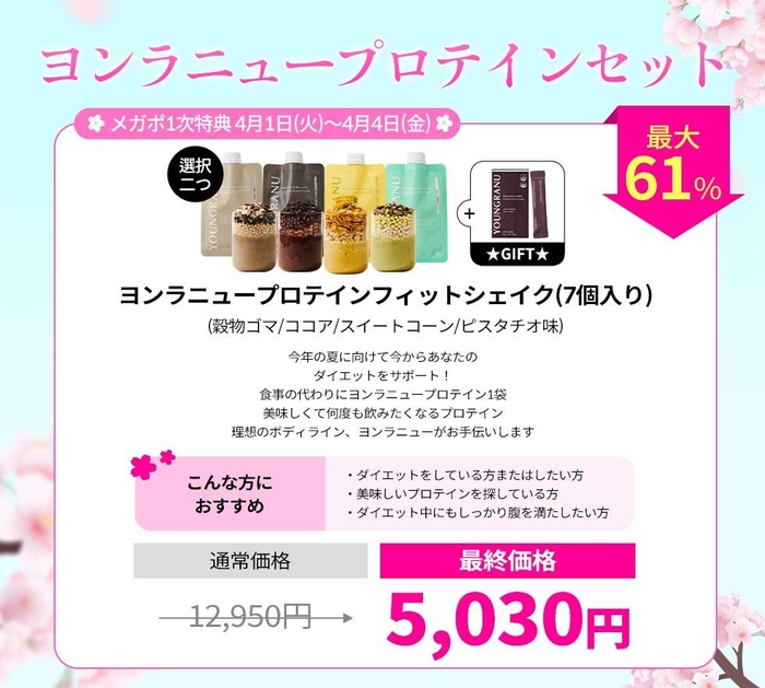 このたび2025年4月1日(火)から4月8日(火)まで開催されるQoo10メガポに参加が決定しました。今回のメガポでは新規・既存フォロークーポン、先着1000名様に贈呈するサンプルセット、新登場したヨンラニュープロテインシェイク発売記念イベントやメガポ限定セールなど豪華イベントを実施いたしますのでこの機会を見逃しなく!
