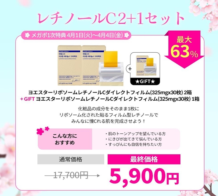 「ヨエスターレチノールCダイレクトフィルム」は、トーンアップ、シワケア、皮膚再生、肌の弾力UP、ニキビケアを実現するための最適なアイテムです。100%植物性のリポソームレチノール原料とビタミンCなどを配合し、肌の悩みに幅広くアプローチします。