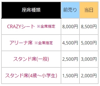 ※CRAZYシート・アリーナ席は一席空けて販売いたします。
