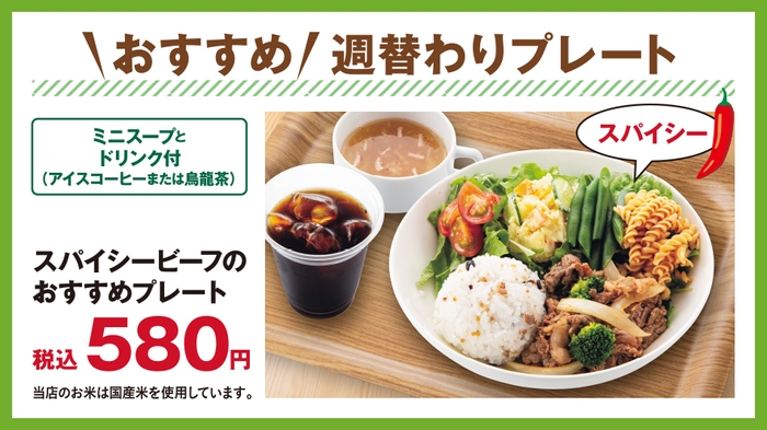 また当店では、週替わりでお得な「おすすめ 週替わりプレート」を提供しています。ワンプレートにメインディッシュと雑穀ごはん、サラダを盛り合わせました。4つのメニューを毎週木曜日に更新していきます。