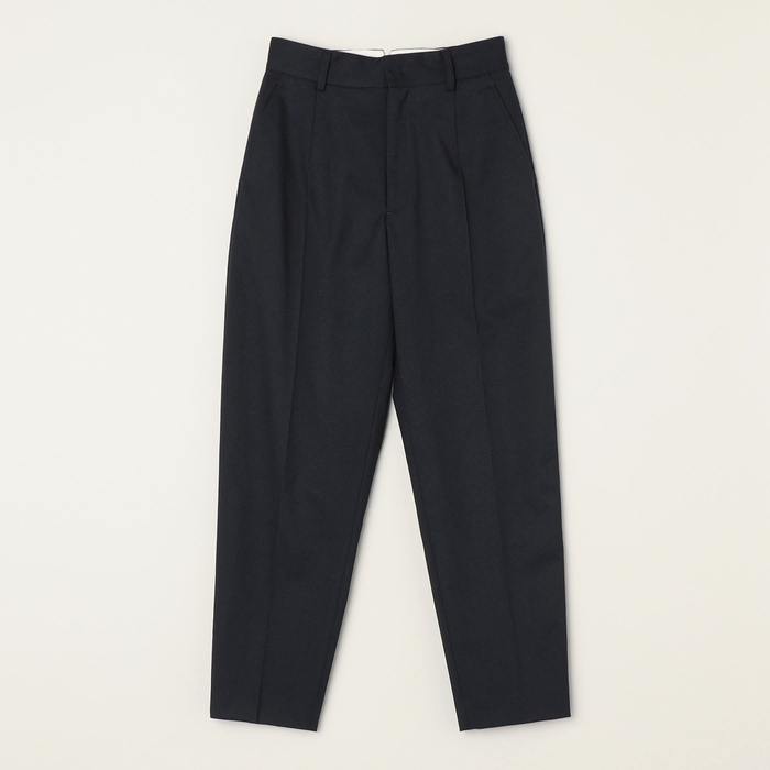 デザインとパターンにこだわり、女性らしい美しいシルエットを追求したテーパードパンツ。ベルト部分のマーベルトや前開きの天狗づくりなど、本格的なメンズ仕様を採用しました。ヒップ回りにはしっかりとゆとりを入れながらも、裾にかけて入ったシャープな脇のラインが腰の位置を高く見せてくれるため、履くだけでスタイルアップします。ブレザーと同素材を使用しているので、スーツとしても着用いただけます。