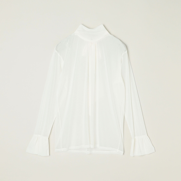 柔らかい肌触りのチュールメッシュを使用したトレンドのシアー素材のボウタイブラウス。袖口は控えめなフレアカフスのデザインで一枚でもサマになるトップスですが、合わせるアイテムによってレイヤードも楽しめます。防静電加工を施し、また自宅でお洗濯が可能なイージーケアアイテムです。