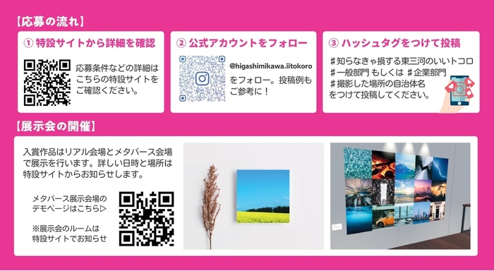 テーマを「I♡東三河~知らなきゃ損する東三河のいいトコロ」とし、プロ・アマ問わず、一般部門・企業部門に分けて写真を公募。現地に住んでいる方だからこそ知っている、愛知県豊橋市東三河地域のおすすめスポットや秘密の場所、知る人ぞ知るグルメなど、地域の魅力を参加者同士でシェアしあいながら楽しみながら発信していくイベントです。受賞作はメタバース空間での展示会を行います。