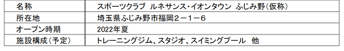 株式会社ルネサンス(本社:東京都墨田区、代表取締役社長執行役員:岡本利治、以下「当社」)は、「スポーツクラブ ルネサンス・イオンタウン ふじみ野(仮称)」を2022年夏に出店することといたしましたので、以下の通りお知らせいたします。