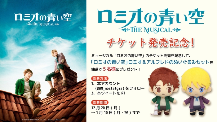 ミュージカル「ロミオの青い空」のチケット発売を記念して、「ロミオの青い空」Twitter公式アカウント(@WM_nostalgia)では、プレゼントキャンペーンを実施いたします。賞品としてロミオとアルフレドのぬいぐるみをご用意いたしました。受付期間は2021年12月20日(月)から2022年1月10日(月・祝)まで。皆様のご応募お待ちしております。