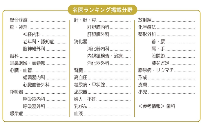 【掲載分野】総合診療/神経内科/老年科・認知症/脳神経外科/眼科/耳鼻咽喉科/頭頸部外科/循環器内科/心臓血管外科/呼吸器内科/呼吸器外科/感染症/肝胆膵内科/肝胆膵外科/消化器内科/内視鏡検査・治療/消化器外科/腎臓/高血圧/糖尿病/甲状腺/泌尿器/婦人/不妊/乳がん/血液/放射線/化学療法/整形外科/膠原病・リウマチ/形成/皮膚/小児/<参考情報>歯科