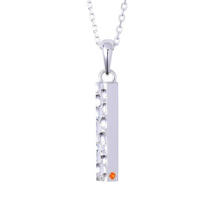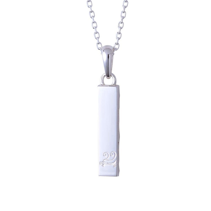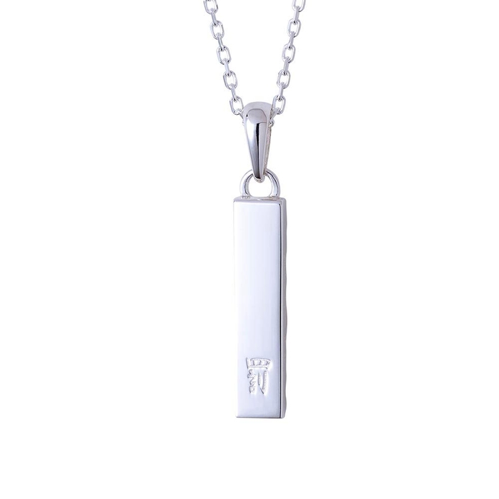 バータイプのネックレストップは槌目加工と鏡面加工の異なるテクスチャーで仕上げ、喧嘩をしても立ち上がる姿を2層で表現しました。