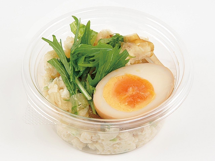 ・和風のポテトサラダをベースに、かつおぶし、水菜、味付き半熟茹で玉子をトッピングし、手に取った時の重量感があり、満足できる一品です。