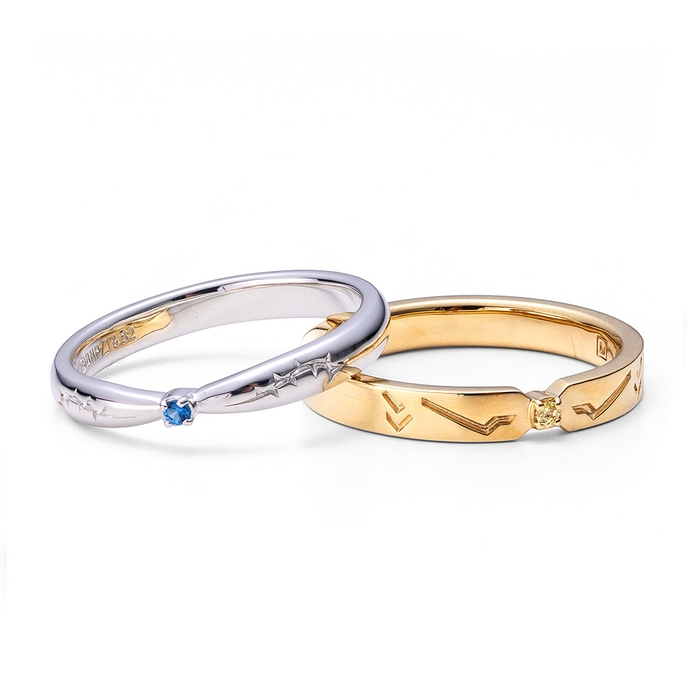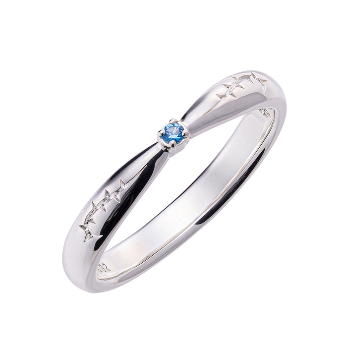 イメージカラーストーンをセットした甲丸フォルムの表面には、スーツの背中のモチーフを取り込み、内側には雪の結晶の形を刻印を施しました。