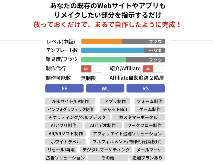 CMS世界最高峰「Bubble」をはじめ、世界中の人気ノーコードツールを1,000種類以上から厳選して、自由に選んで制作・運用・転売が可能!タイトルをリクエストして無料で追加利用も可!