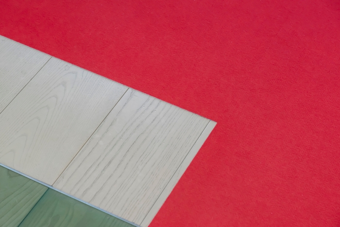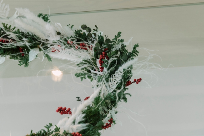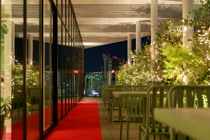 toggle hotelの特徴でもある、色で気持ちを切り替えることを意識した。メインエレメントカラーであるグリーン・ホワイトにレッドカーペットを部分的に敷き、色の組み合わせでクリスマスを想起。また、賑やかで煌びやかなクリスマスの日常を切り取りそれらの色に合わせてゴールドやシルバーなど、天井の照明によって反射が綺麗に映るアイテムを部分的に取り入れた。レッドカーペットはエレベーターの扉が開いた瞬間から始まり、入り口から受付、レストルーム、そしてサイドに設けられたテラスに至るまで全ての動線を可視化している。特にカフェカウンターまで突き当たりそこから左右に分岐させたレッドカーペットはテラス席に自然と行きたくなるような動線の誘導を意識した。色のイメージだけでなく、レッドカーペットを歩くという行為に特別感や高揚感を感じて楽しんで欲しいという思いからこれをメインコンセプトとした。そして、各テーブルにはウッドボードの上に生花やドライフラワーを添えた。ここでもメインエレメントカラーであるレッドやグリーン、ホワイトを構成して全体的なバランスを重視した。レッドカーペットで構成された空間は直線的で動きが少なかった為、雲龍柳など枝ものの生花を取り入れることで直線的な空間に曲線的な動きをつけた。カフェブースとレストルームには一定の距離があったが、全体的な雰囲気にムラを作りたくなかった為、レストルーム全室と入り口前にドライフラワーを添えた。テラス席は夜にも楽しんで欲しいという思いから、元々あった植物にイルミネーションライトを設置。日中は日当たりの良い場所で、夜はライトと窓に反射されたレッドカーペットで特別感を感じながら植物に引っかけられたパラシュートサンタを探して欲しい。クリスマスツリーというアイコン抜きでいかにクリスマスを祝福させるかを1番意識した。