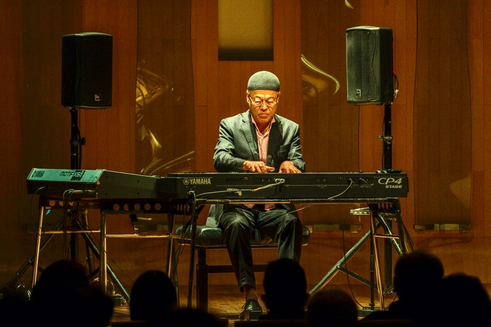 大きな拍手の中ステージに登場したエイコン氏が最初に奏でた曲は、2015年に日本レコード大賞の企画賞を受賞したアルバム『心と体を整える』に収録されたエイコン氏のオリジナル曲「ECHO」。1曲目が終わり「528Hzの音楽を聴くと副交感神経が優位に働き、自律神経を整える効果があります。今日は日頃の疲れを癒していただいて、遠慮なく、ぐっすりとお休みください」というエイコン氏のMCに、会場は一層リラックスムード。MCに続いて、同じくレコード大賞企画賞を受賞したアルバム『自律神経を整える音の処方箋』から「SOUVENIR」「MIZUTAMAHIME」、また最新オリジナルアルバム『INORI』から「INORI」「レクイエム」などエイコン氏のオリジナル曲が次々と演奏された。
