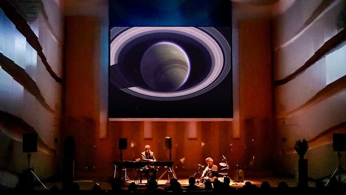 そしてコンサートの中盤、いよいよ「眠ってください」の時間、パーカッショニストの山村氏とエイコン氏の40分間にわたる即興演奏のコーナーがスタート。コーナーが10分を越えた頃には、会場のあちこちから「カラン」「カタン」という音がする。どうやら手にした携帯電話を落としてしまったらしく、静かな寝息も聞こえてきた。まさにお客さまが求めていた「良質な睡眠」導入の瞬間だった。しかしその一方で、ステージのスクリーンには今回映像の演出を担当したラファエル小関彰氏がAIを一切使用せずに創り出した太陽系の美しい惑星たちが、エイコン氏の演奏と絡み合いながら、見事にライブを演出した。その映像の素晴らしさに目を奪われた人たちにとって、眠ってしまうにはあまりにももったいない演出だった。