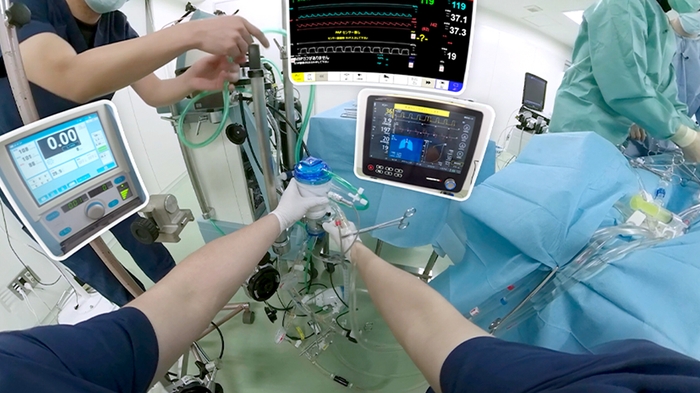 新型コロナウイルス感染症が蔓延する現在の状況下では、医師や臨床工学技士などのメディカルスタッフに向けて臨床見学をはじめとしたECMO教育の提供が十分に行えていません。本VRコンテンツは、臨床現場やセミナー会場に集まることなく、いつでもどこでも何度でもリアルな臨床体験を提供し、ECMO機器の使い方を医療従事者へ提供するための教育VRコンテンツです。