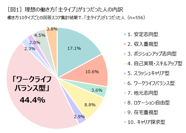4割以上が「ワークライフバランス型」を理想の働き方とする。2位は「安定志向型」