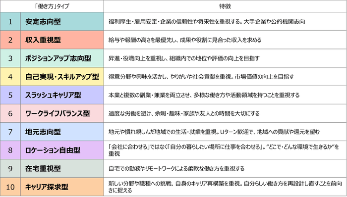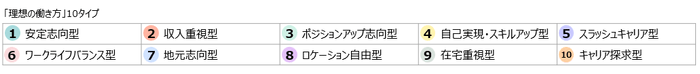 「理想の働き方」を下記の10タイプに分類し、回答者は、タイプごとに設定された代表的な価値観フレーズへの共感度を5段階で評価。回答スコアを項目ごとに合算し、最高得点となったタイプを回答者の「主タイプ」として、理想の働き方のタイプを導き出しました。設問や集計方法の詳細は、本プレスリリースの末尾で紹介しています。