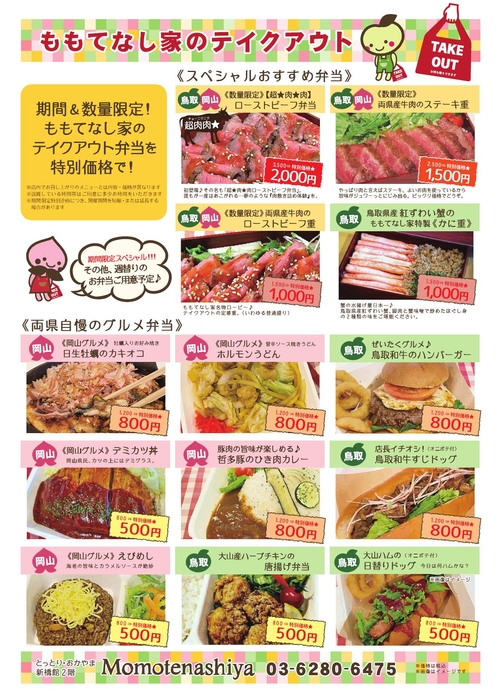 とっとり・おかやま新橋館2階のビストロカフェももてなし家では、鳥取・岡山両県自慢の食材を使ったテイクアウト弁当を特別価格で販売中です!