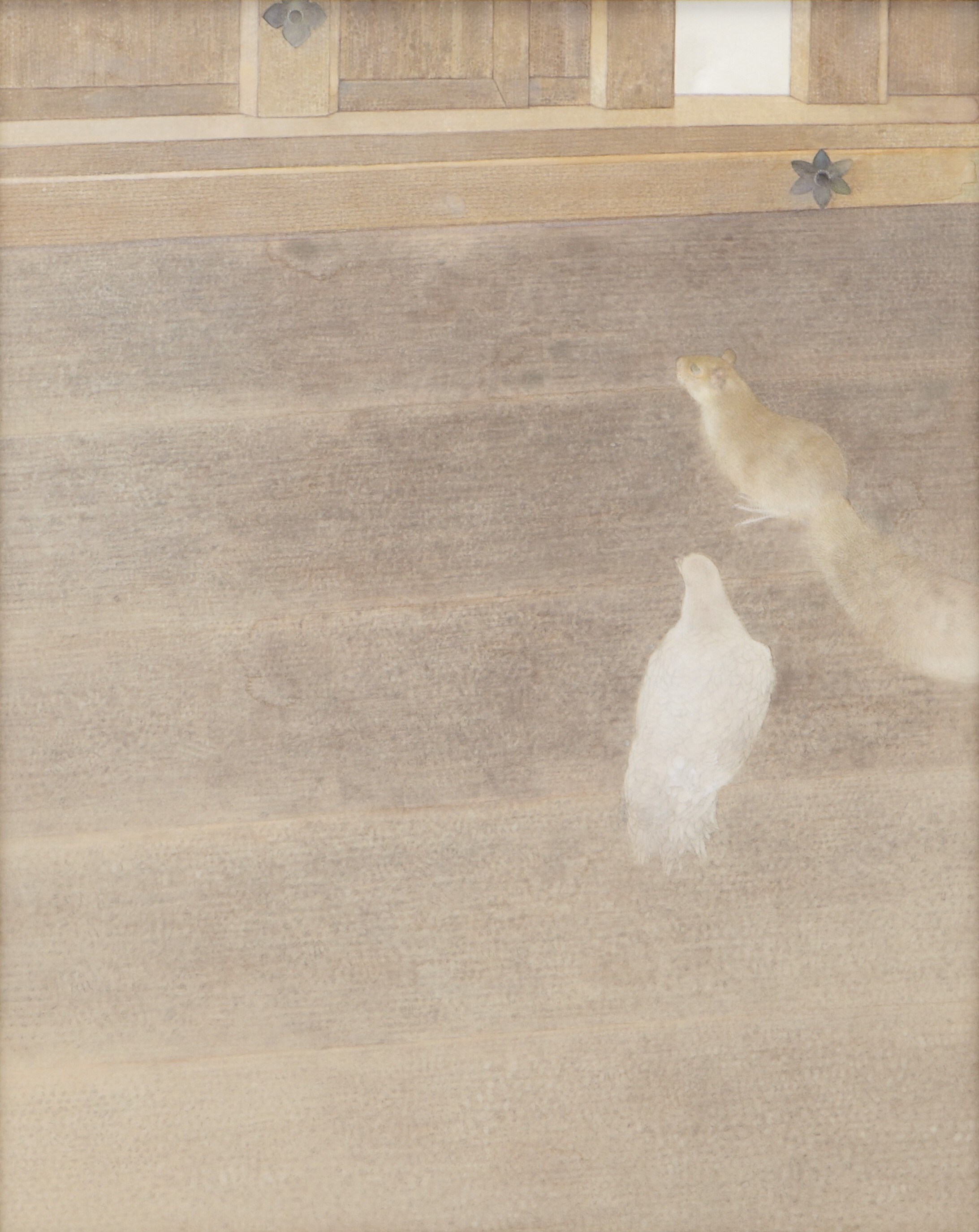 禅の教えと、高い精神性を持つ中国宋時代の絵画との出会いが、新たな画境を拓く契機となり、淡くデリケートな色調に生きるものへの深い想いを重ねた独自の世界を築き上げました。真摯に向き合い描かれた動物たちには、悲哀とユーモアを秘めた独特の情感にあふれ、それが竹内芸術の魅力となっています。