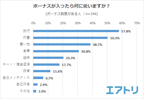 TOP3は、1位「旅行(57.8%)」、2位「貯蓄(50.3%)」、3位「買い物(38.7%)」となりました。