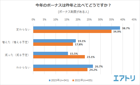 最多は「変わらない」と回答した人が38.7%となりました。昨年よりも「減った(減る予定)」(2023年:15.5%、2022年:23.1%)人は7.6ポイント減少し、「増えた(増える予定)」(2023年:19.1%、2022年:17.8%)人は微増となりました。