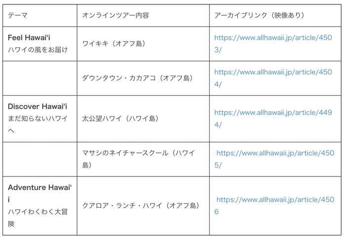 ライブ配信から約1週間後に「allhawaii」にアーカイブ映像閲覧⽅法をご案内します。各オ ンラインツアーの詳細ウェブサイトから閲覧(有料)が可能です。