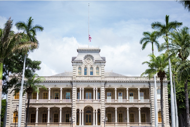 イオラニ宮殿は、1882年、ハワイ王朝7代⽬のカラカウア王によって建てられた王族の公邸です。1959年にハワイがアメリカ50番⽬の州となり、新州政庁が建てられるまでの約75年間、ハワイの政治の中⼼地であり、カラカウア王や妹のリリウオカラニ⼥王らが実際に暮らしていた宮殿です。1969年、新政庁の完成と同時に、イオラニ宮殿復興が始まりました。約10年の修復⼯事を経て、現在のイオラニ宮殿はハワイ王朝の⼤切な歴史的建造物として復活しました。宮殿内は、⽇本語ガイドによるツアーもしくはオーディオによるツアーに参加することで⼊館でき、展⽰品を鑑賞することができます。