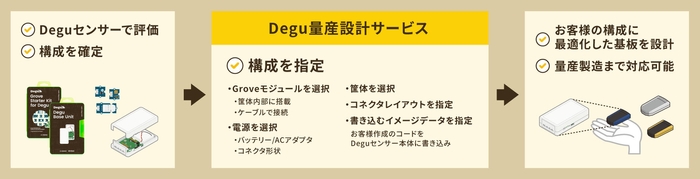 「Degu量産設計サービス」は、スターターキットで試作したDeguセンサーを製品化し量産製造まで対応するものです。マッチ箱やライター程度の小型サイズのものなど、あらかじめ用意されている複数種の筐体の中からお客様が選択したものに併せてSeeedが基板を再設計し、量産とキッティングまでを行います。試作時にGroveモジュールの中から選択したセンサーやアクチュエータをそのまま利用しながら、小型化・シングルボード化することが可能です。